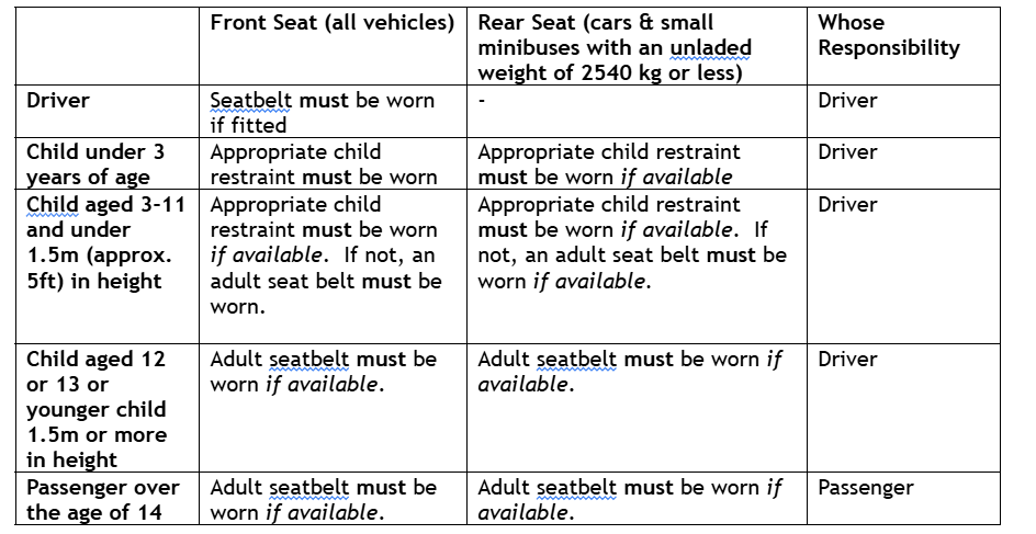 Seat belts must be worn if they are available, unless you are exempt on medical grounds (following issue of “Exemption from compulsory seatbelt wearing” certificate by your doctor).  All occupants of the car, front and rear, must use their seat belt for all journeys.  This applies also to pregnant women, unless they are medically exempt.  An exemption also applies whilst carrying out a manoeuvre (including reversing).